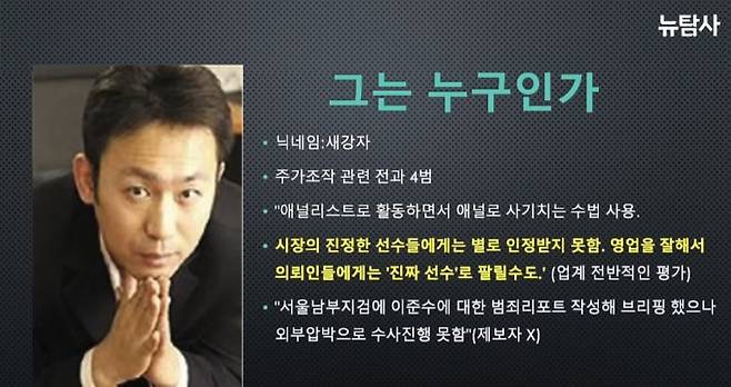 도이치모터스 주가조작 사건의 핵심 인물로 지목되며 현재 특검 수사를 받고 있는 이준수 씨는 과거 '새강자'라는 닉네임으로 활동했던 전업 투자자이자 주식 전문가다.